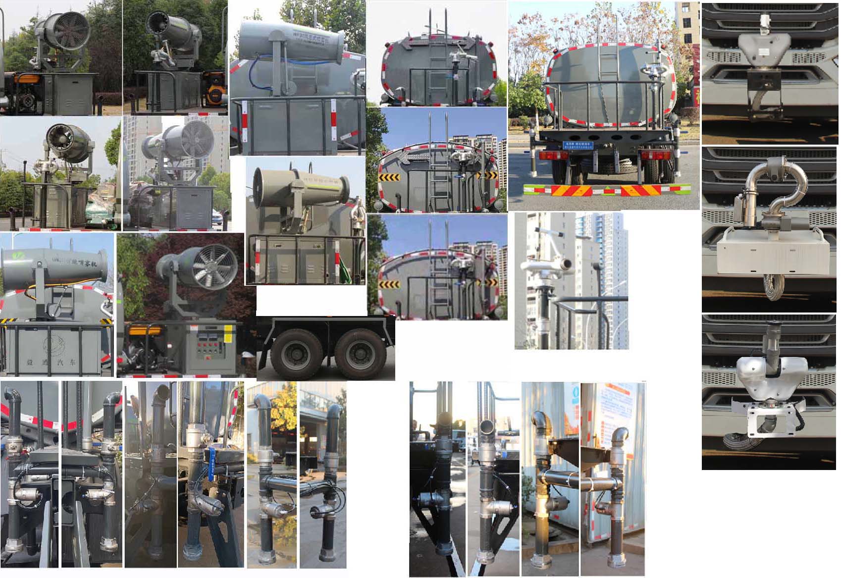 該車主要用于城鄉園林綠化噴灑;主要裝置為罐體及噴灑裝置;罐體總容量:14.81立方米;罐體有效容積:14.11立方米;罐體外形尺寸(長×長軸×短軸)(mm):6800×2390×1620;側、后防護材料均為:Q235,連接方式均為:螺栓連接,后部防護截面尺寸(mm):120×50,后部防護離地高度(mm):490;ABS型號:446 004 6300;ABS生產企業:采埃孚商用車系統(青島)有限公司.選裝EBS,EBS系統控制器生產企業:采埃孚商用車系統(青島)有限公司司,型號:EBS3.隨底盤選裝限速裝置;限速裝置限速(km/h):89;僅采用4325+1350mm軸距改裝.隨底盤選裝駕駛室,選裝噴霧裝置樣式;選裝水炮支架位置,選裝弧形噴灑裝置,選裝箭頭燈裝置,選裝不帶箭頭燈裝置選裝自動球閥安裝位置,選裝擋泥板樣式.選裝罐體頂部無高位花灑裝置,選裝后部樣式。選裝前部電子炮樣式,安裝電子炮時整車長為10750mm,前伸500mm。