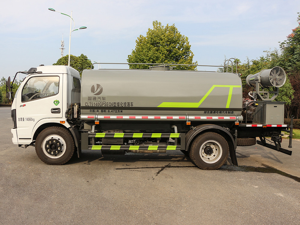 東風福瑞卡霧炮9方灑水車整車型號 CLT5120GPSEQ6 型綠化噴灑車 2 發動機型號 D30TCIF1 3 發動機馬力/功率 云內 170 馬力/125KW 4 發動機排量 2977ML 5 變速箱 長泰 8 檔 6 輪胎規格 8.25 鋼絲胎 7 軸距 3800 8 總質量 11995KG 9 整備質量 4920KG 10 額定載質量 6880KG 11 整車尺寸(長×寬×高) 7.3*2.25*3 12 罐體容積 9 方 13 燃料種類 柴油 14 排放標準 國六 15 水泵型號 40/50 16 罐體材質 Q235 碳鋼