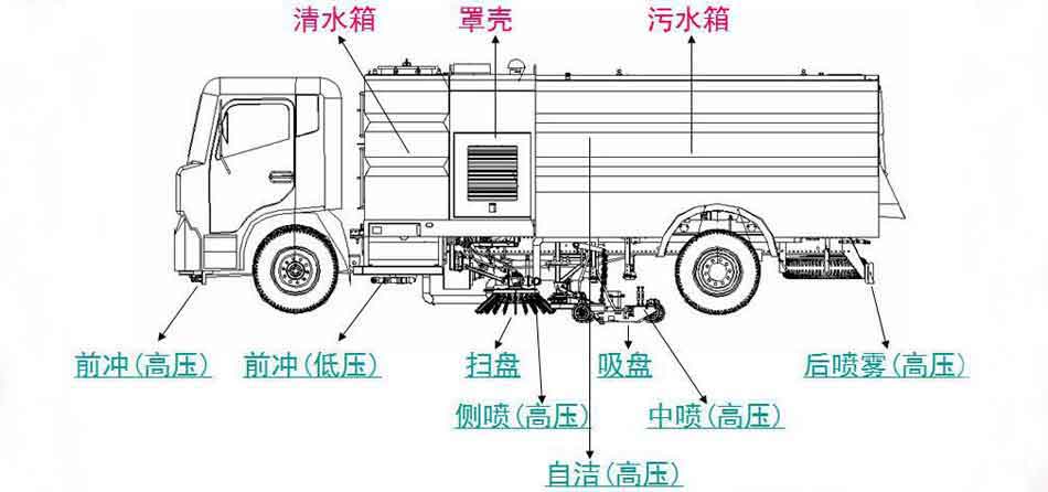 東風D9洗掃車上裝配置:帶不銹鋼箱體,容積為9立方,帶2個中置掃盤,康明斯170馬力副發動機;意大利馬達;德國高壓水泵(前沖/側噴/中噴/后噴霧/沖洗水槍/垃圾箱自潔裝置);萬向高壓路沿清洗噴頭,威龍低壓泵(前沖);不銹鋼垃圾箱;不銹鋼管高壓管路;德國控制器;韓國控制箱;PLC一鍵控制;尾部LED箭頭燈;機油、垃圾箱、水箱均帶防溢低水位報警裝置;倒車及洗掃狀態室內監視器。18m高壓沖洗卷盤。清掃寬度3.5m;清洗壓力10MPa;吸入粒度φ110mm。