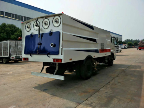 東風天錦吸塵車 上裝配置:2立方水箱、8立方不銹鋼垃圾箱,中置吸盤、康明斯副發動機、施耐德控制開關、海普瑞思電磁閥組、無極變速自動離合器、免維護離心式風機、不銹鋼垃圾箱、高精度垃圾箱過濾系統(最高可達0.3微米)、進口脈沖閥、PLC一鍵智能控制系統、尾部LED箭頭燈、手動泵應急系統、車尾霧狀噴水潤濕功能。可選裝前置雪鏟、掃雪滾。