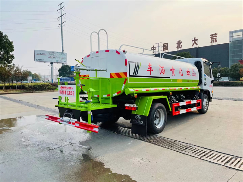 整車(chē)帶一個(gè)專用灑水泵(垂直最大吸程6米),灑水寬度14米,射程28米。多功能灑水車(chē)配備2個(gè)前沖(噴)(能將路面泥巴、塵土、垃圾沖干凈);2個(gè)后灑(能均勻地將水灑在路面,一次灑水寬度14米)、2個(gè)側(cè)噴(花灑)(能均勻地將路旁綠化帶澆灌)、帶1個(gè)后工作平臺(tái),平臺(tái)上安裝1個(gè)綠化灑水高炮(灑水炮可全方位旋轉(zhuǎn),可連續(xù)調(diào)成直沖狀、大雨、小雨、毛毛雨,霧狀可調(diào)節(jié)沖洗高大樹(shù)木),引水時(shí)間<5min,流量90m3/h。帶1個(gè)消防接頭,帶1個(gè)自流閥,1個(gè)過(guò)濾裝置、人性化爬梯及側(cè)防護(hù)欄,安裝灑水音樂(lè)喇叭。