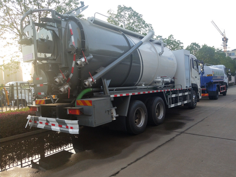 由于吸糞膠管始終浸沒于液面上,糞罐內的空氣被抽吸后,因其得不到補充而越來越稀薄,致使罐內壓力低于大氣壓力,糞液即在大氣壓力使用下,經吸糞膠管進入容罐。或者由于虹吸管接近罐底,空氣被不斷排入糞罐時,因其沒有出路而被壓縮,致使罐內壓力高于大氣壓力,糞液即在壓縮空氣的作用下,經虹吸管,吸糞膠管排出罐外。吸污車主要用于清洗城市下水道,管道的沉積物,死角泥溝的疏通,也可用于清洗工業排液管道,壁面等,并可兼作灑水,運水和沖公路用,緊急時可用于救火。